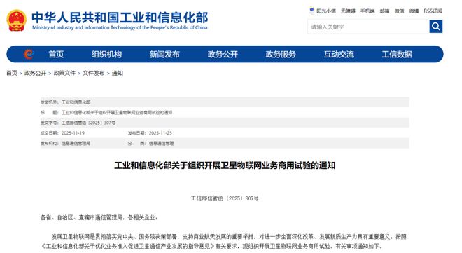 C114讯 12月5日消息(艾斯)近日,工业和信息化部正式印发《关于组织开展卫星物联网业务商用试验的通知》,在全国范围内启动卫星物联网商用试验工作,为期两年。此次试验旨在丰富卫星通信市场供给、激发市场主体活力、提升行业服务能力、建立安全...